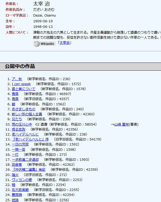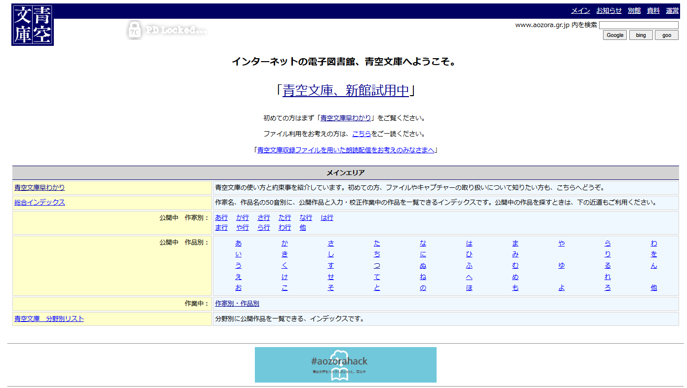 読書好きの方はご存知だと思いますが「インターネット電子図書館」と呼ばれるもので、1997年の開始以降、ボランティアの方たちの尽力により、著作権保護期間が満了した作品が無料で公開されています。※作家の死後70年を経過したものが対象です。