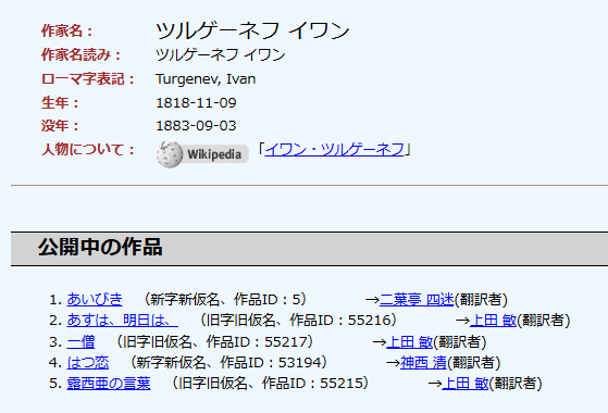 青空文庫では5作品を読むことができます。やはり代表作の一つ「はつ恋」を読みたくなりますね。実は若かりし頃、文庫本で「はつ恋」を読んだ記憶があるんですが、すっかり内容を忘れていました。ということで現在読んでいるのはこの「はつ恋」なんです。おそらく半分くらいは読み終えているんですが、主人公の青年が隣家に越してきた公爵令嬢へ恋心を抱く展開は、読みながら思い出したんですが結末が靄の中にありまして。悲恋に終わるのは間違いないのですが、どんな悲恋だったのか、、、 というわけで結末を楽しみにして読み進めていきます。